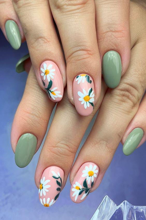 Soft sage green and blush pink create a calm spring base, finished with hand-painted white daisies. The look feels fresh, earthy, and effortlessly cheerful early spring.