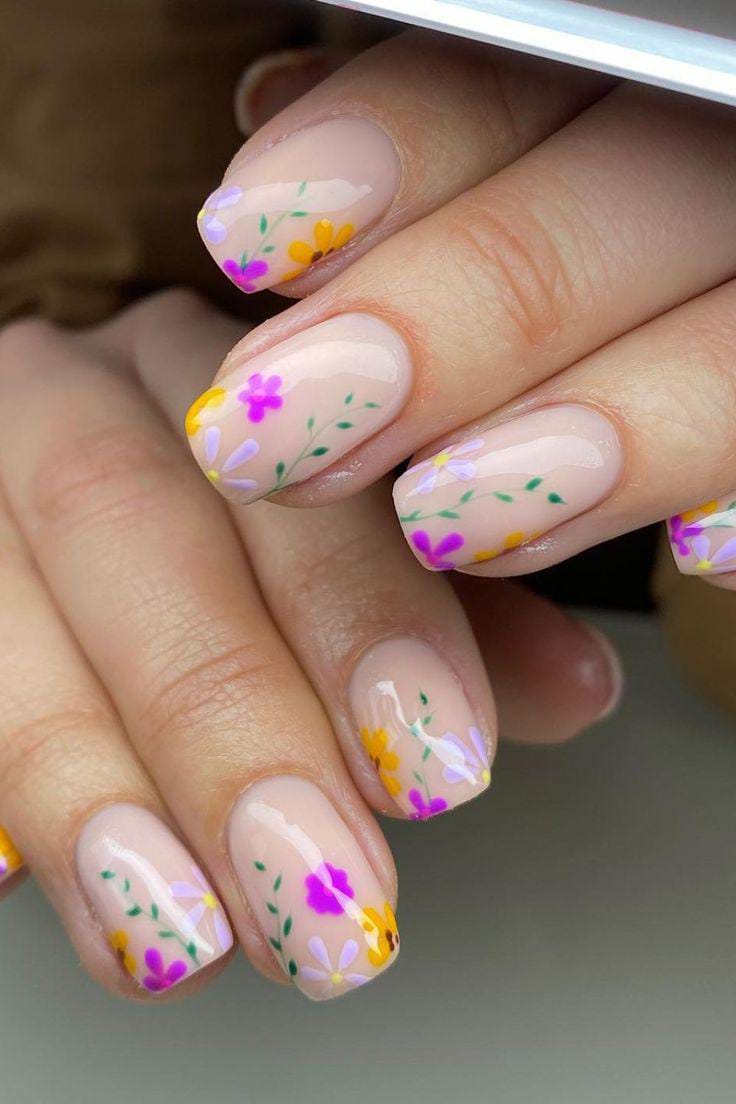 This design features a sheer pink base with delicate floral accents along the tips in soft purple, yellow, and green. The overall vibe feels fresh, minimal, and perfect for early spring days.
