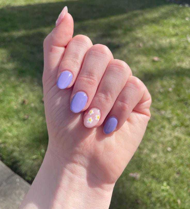 Gentle lavender nails with a small daisy accent keep the design simple and sweet. The vibe is fresh, youthful, and perfect for early spring days.
