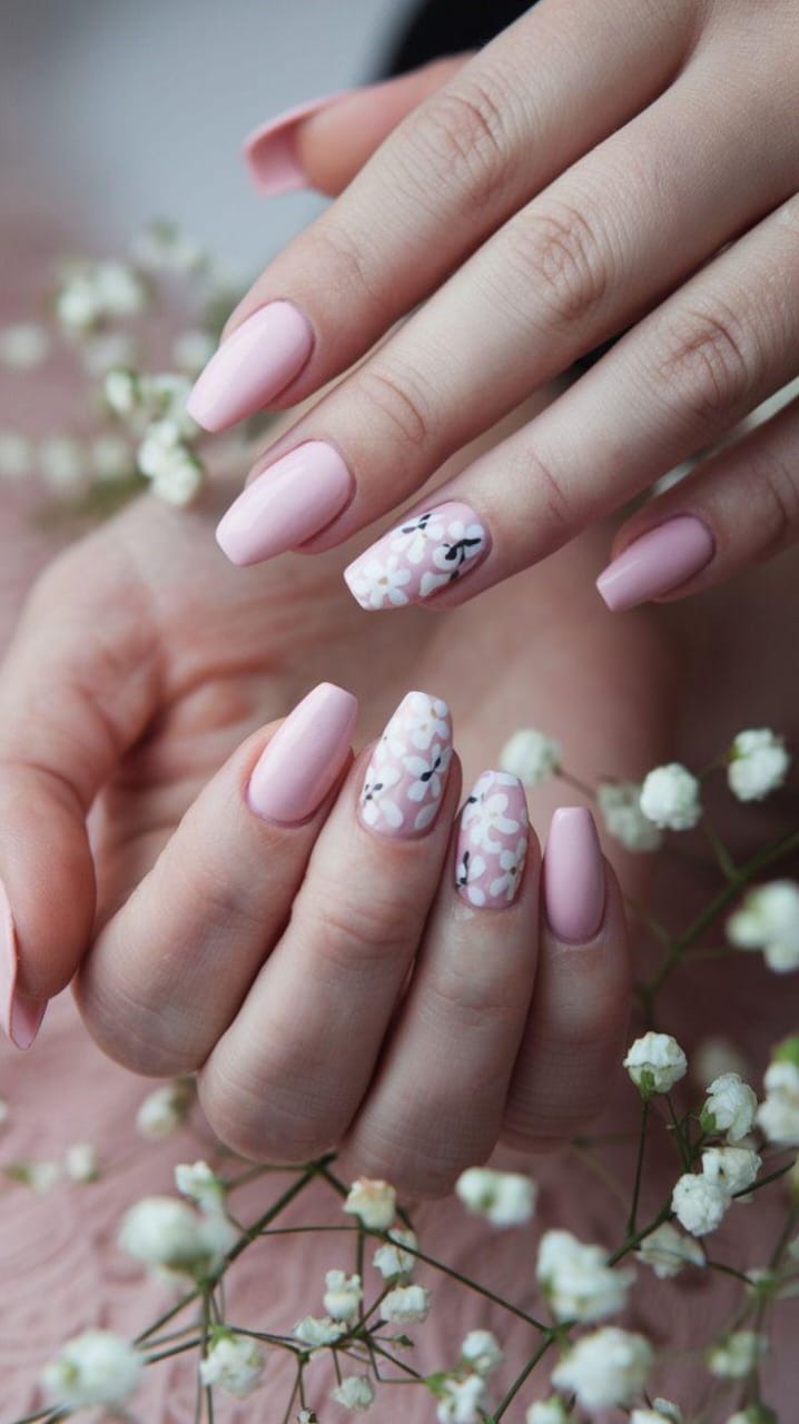 Soft blush pink nails give this design a clean and graceful look. White floral accents add a romantic, early-spring feel. The overall style feels calm, feminine, and timeless.