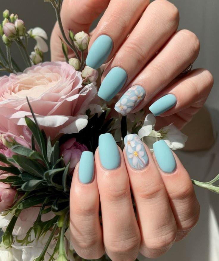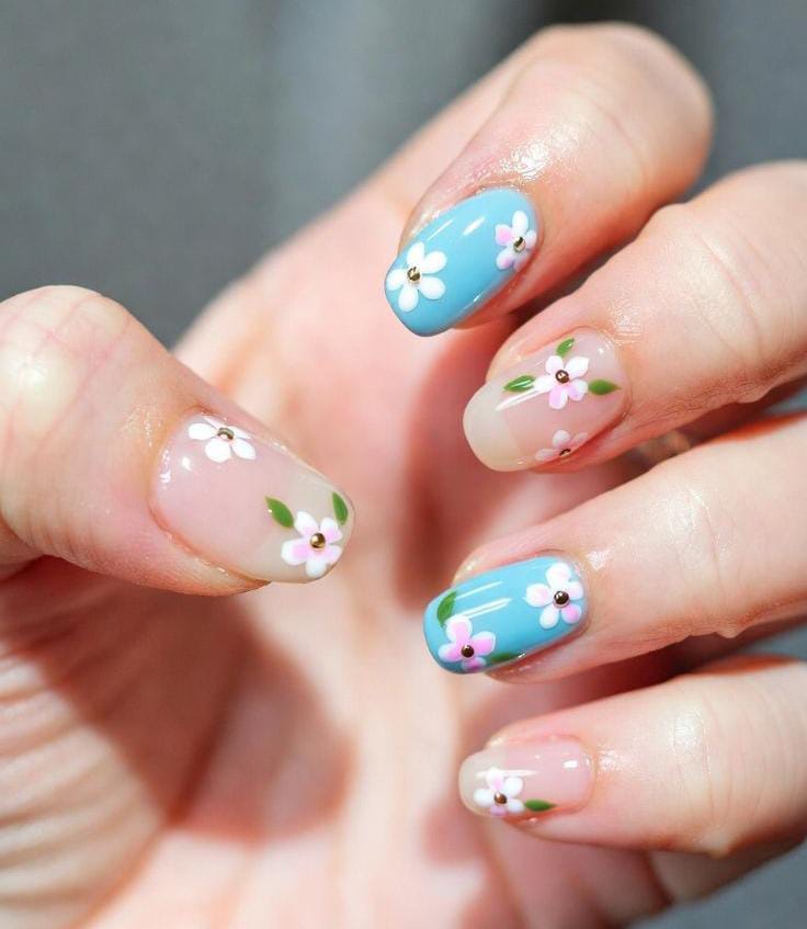 Soft blue nails paired nude with minimal floral details create a calm and airy look. The design feels clean, fresh, and effortlessly early spring-ready.