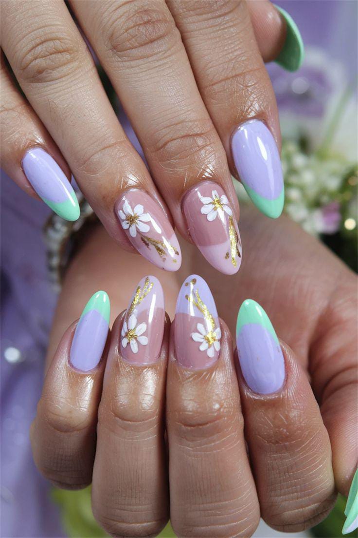 Lilac and mint tips combine with white floral details and subtle gold accents. This set feels polished yet light, capturing the essence of early spring.