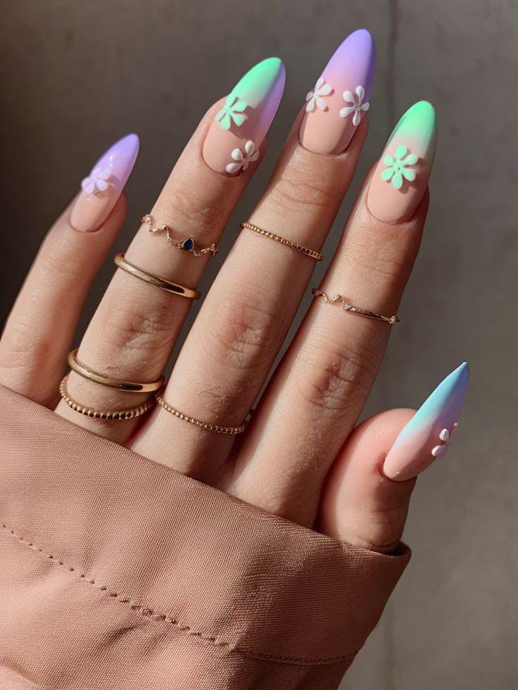 These nails combine nude bases with pastel ombre tips in lavender, mint, and baby blue, finished with simple white 3d flower details. The look is airy, playful, and early spring-forward.