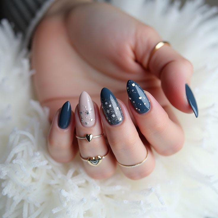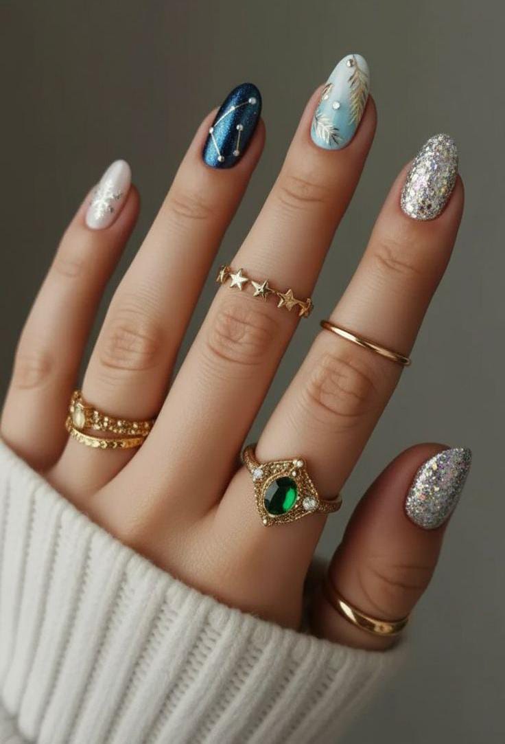 This design mixes deep blue shimmer, icy white accents, and soft winter motifs with a touch of sparkle for a magical, star-kissed early-winter vibe. It feels elegant and festive without being overdone.
