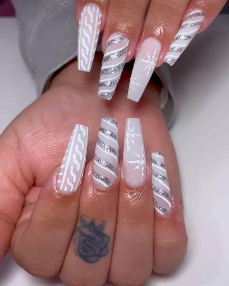 White matte nails with silver glitter stripes and delicate snowflakes create a chic, sweater-weather look. It’s a bold yet clean early winter design with a festive twist.