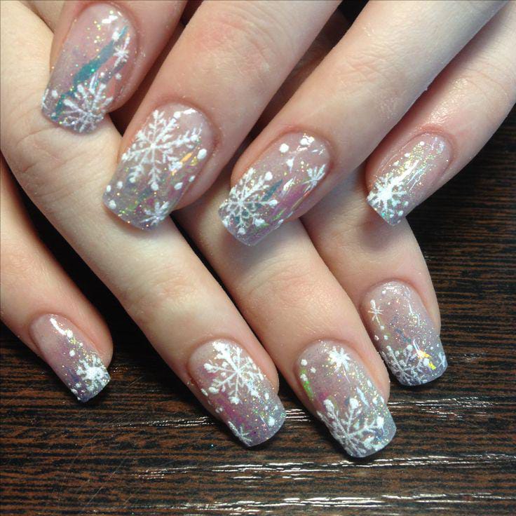 This design features soft, translucent nails dusted with glitter and decorated with delicate white snowflakes, giving a sparkling, icy early- winter look. The overall vibe is light, frosty, and very festive.
