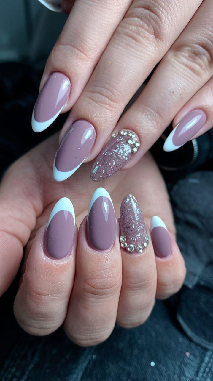 Mauve almond-shaped nails with crisp white French tips are paired with a glittery accent nail embellished with crystals, adding a soft early- winter sparkle. The look is classy with a hint of glam.