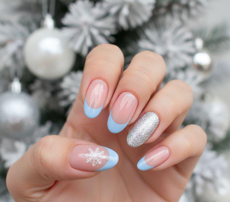 This design features soft baby-blue French tips paired with a single silver-glitter accent nail, creating a crisp and delicate early-winter look. A subtle snowflake accent adds a festive touch without overwhelming the minimal style.