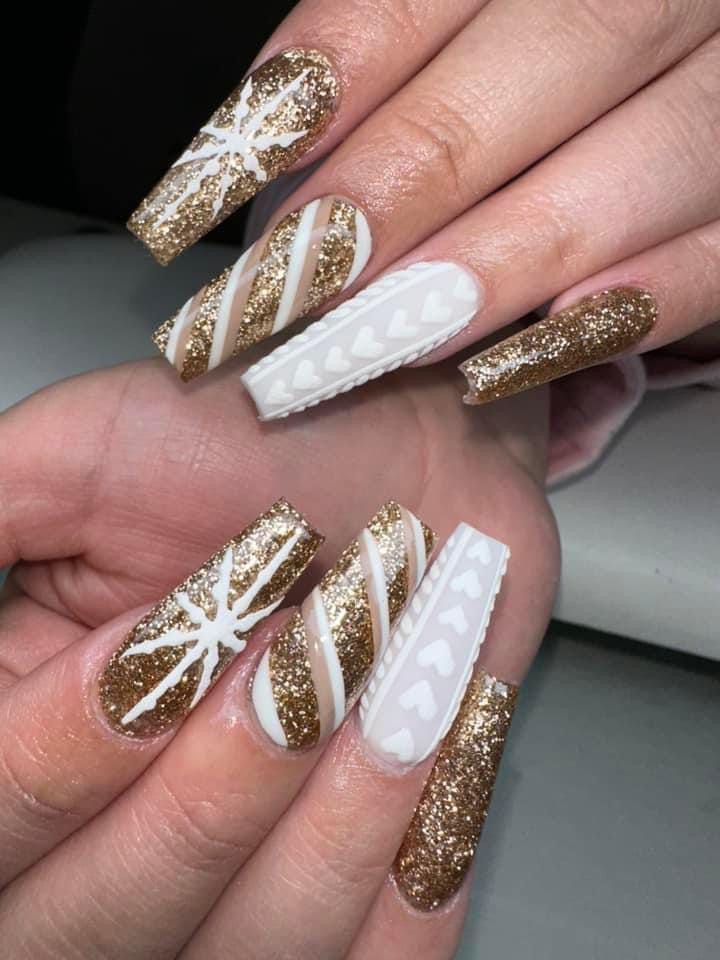 Bold gold glitter nails are paired with white striped, snowflake, and heart-patterned accents, creating a glamorous holiday look that blends sparkle with playful early winter details.