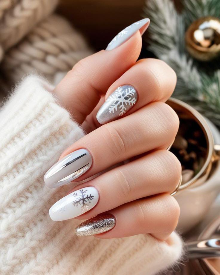 A blend of metallic silver, crisp white, and glittery accents creates a polished, icy look topped with delicate snowflake early winter designs.