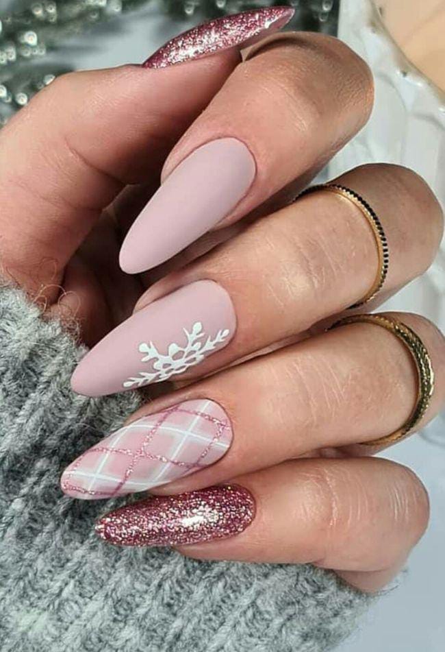 A mix of matte blush pink, glittery rose tones, and a soft plaid pattern come together with a single white snowflake accent. The look feels warm, cozy, and feminine with a touch of early winter sparkle.