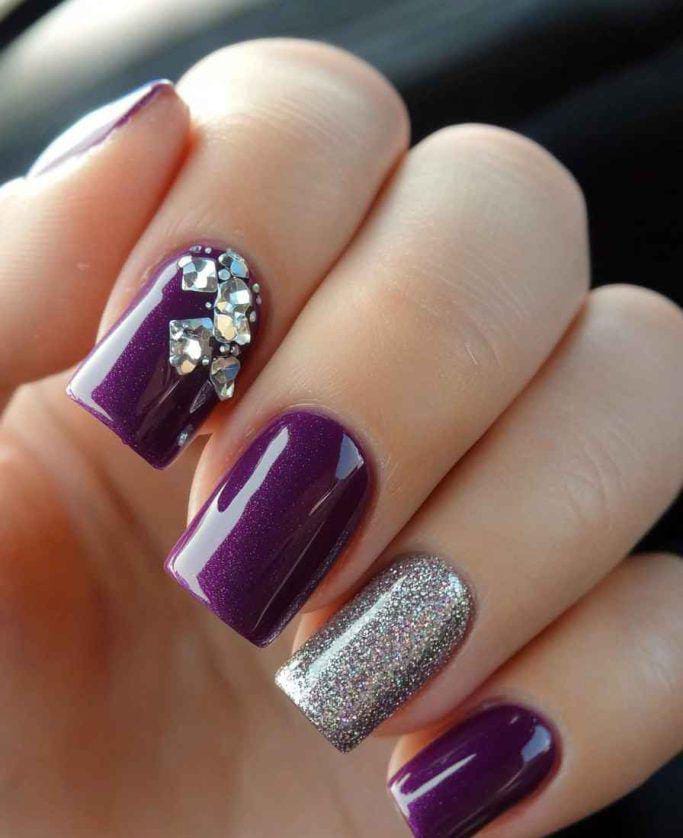 Deep plum nails paired with a silver glitter accent and crystal embellishments create a bold, luxurious early winter look. It’s rich, dramatic, and perfect for festive nights.