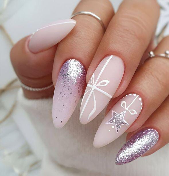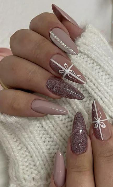 Dusty rose tones pair with glitter textures and white ribbon-style line art, giving the nails a chic “holiday gift” early winter vibe. The mix of matte, sparkle, and glossy finishes adds depth without being overwhelming.