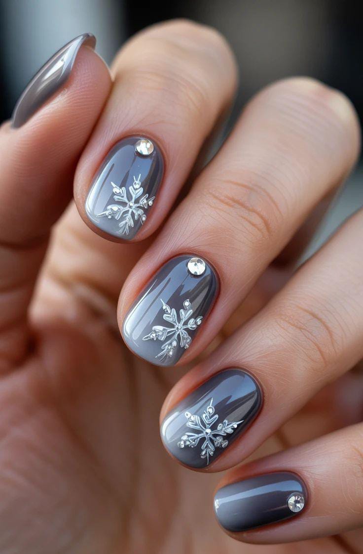 Glossy grey ombre nails paired with detailed white snowflakes and small gem accents, creating a chic, modern early winter feel.