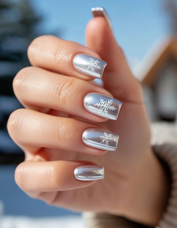 A striking silver-chrome manicure topped with crisp white snowflakes, giving a sleek and frosty metallic early winter appearance.