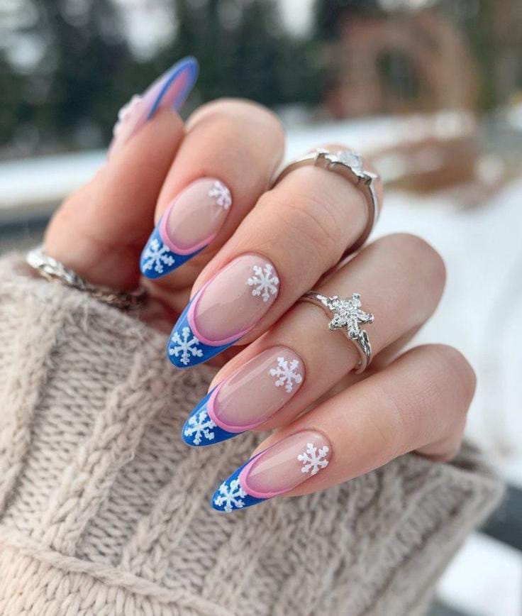 Clear-pink bases flow into bright blue and pink French tips, finished with small white snowflakes for a playful early-winter twist.