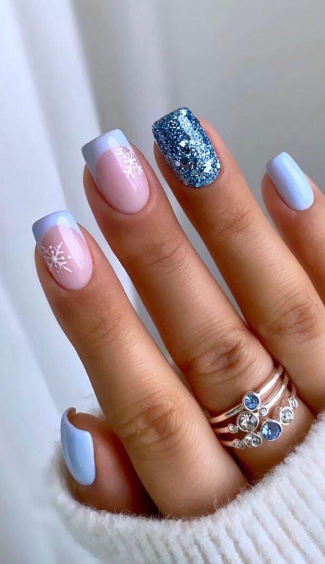 A blend of soft lavender, pink, and icy blue shades with glitter and subtle snowflake accents, offering a playful yet elegant early-winter look.