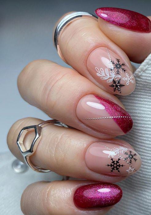 A blend of shimmering cranberry red and soft nude tones, brought to life with delicate winter leaf and snowflake accents. The look feels festive and refined, perfect for early-winter glamour.