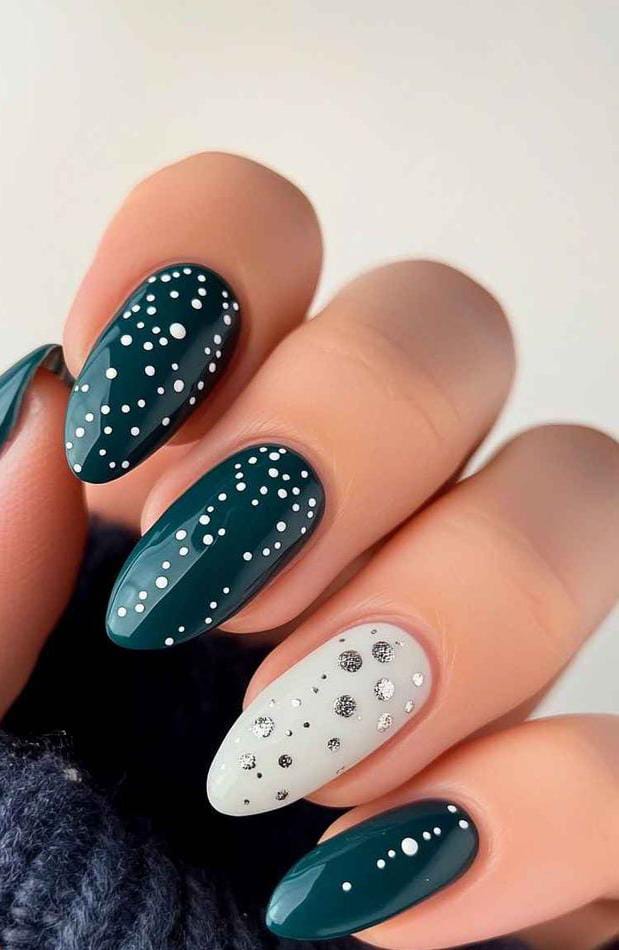 Deep teal nails sprinkled with white dot “snow” and paired with a snowy white accent nail dotted in silver. The design feels crisp and modern, like a calm early winter night.