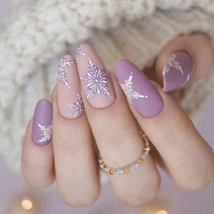 Matte lavender and nude nails decorated with fine white snowflake and purple star patterns for a soft and cozy winter feel. The style is calm, feminine, and perfect for early-winter season chill.