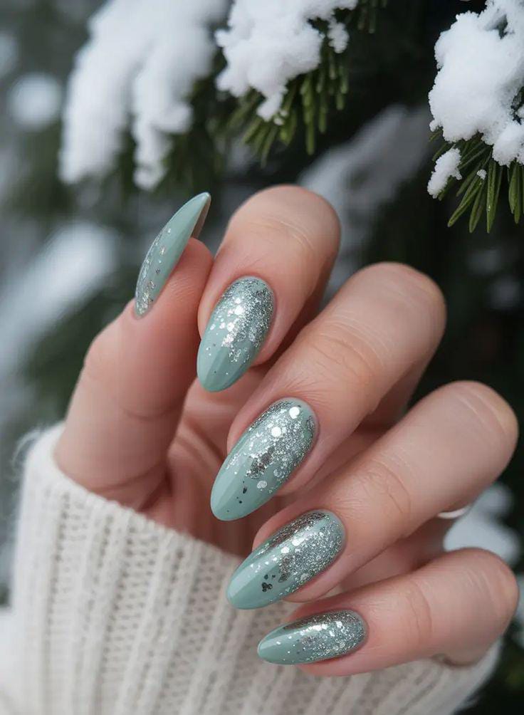 Cool sage-green nails meet sparkling silver glitter that mimics frost and falling snow. It creates a fresh, icy early winter vibe with a soft touch of shimmer.