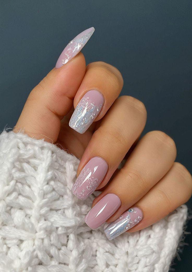 Soft pink nails paired with frosty white marble effects and a touch of silver shimmer. This design feels elegant, delicate, and perfectly suited for the first cold weeks of early winter.
