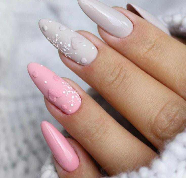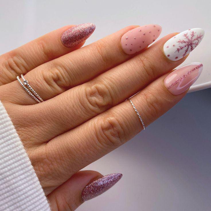 A soft pink and white palette mixed with glittery accents and a delicate snowflake creates a sweet, early wintry look. The almond-shaped nails feel festive yet elegant with their subtle shimmer.