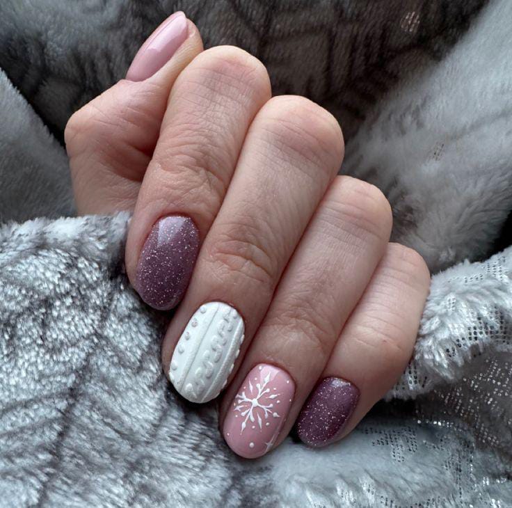 Shorter nails in mauve and soft pink feature glitter, a white knitted pattern, and a simple snowflake for a charming early-winter feel. The combination looks comfortable and seasonal, like a stylish winter sweater.