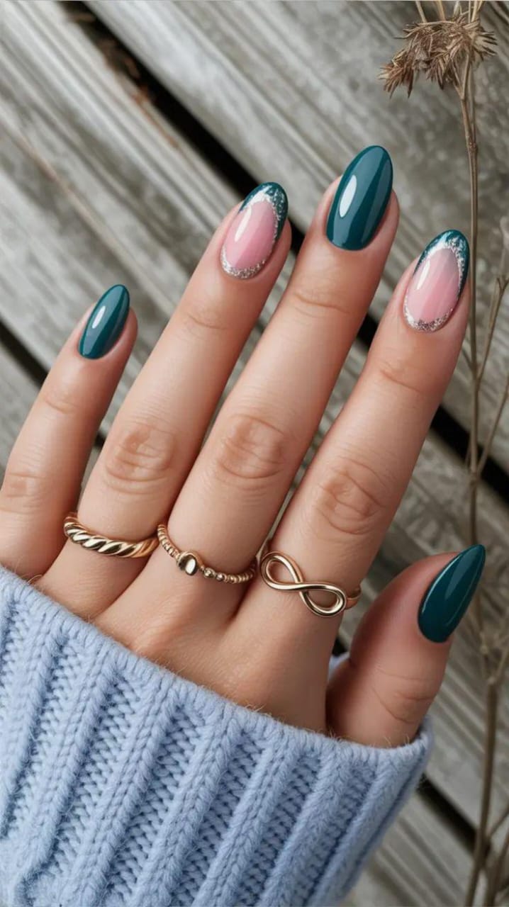Rich emerald nails pair with soft nude cuticle-side French tips edged in silver glitter, giving a chic and modern early winter finish.