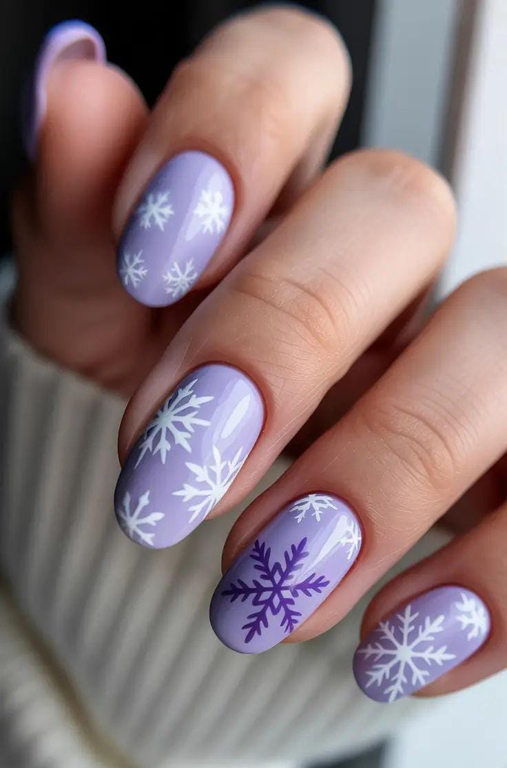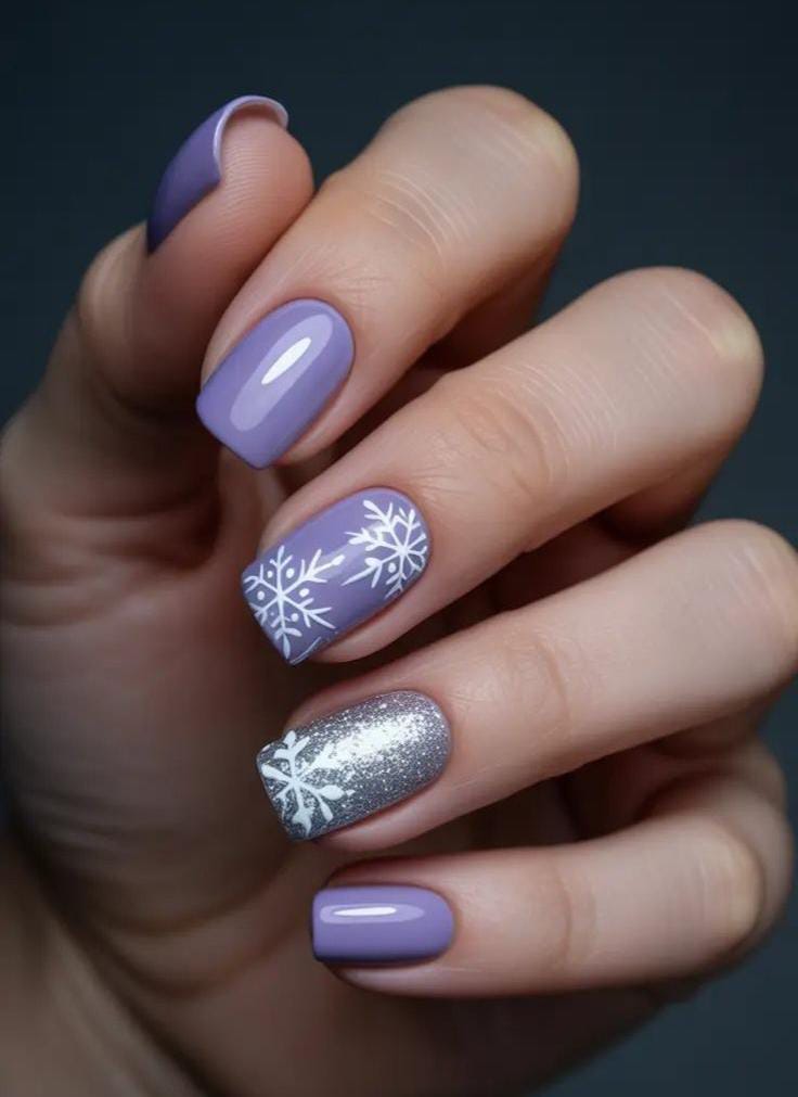 This design pairs soft lavender nails with crisp white snowflake accents and a touch of silver glitter, giving a cool and cozy early-winter feel.