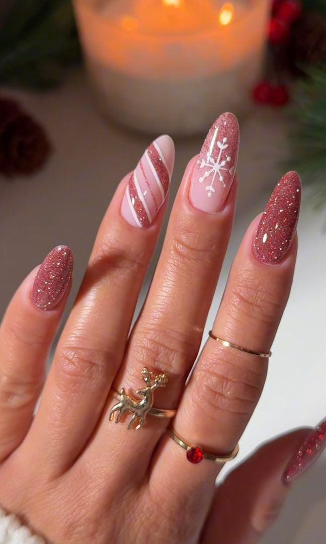 A soft pink base is paired with rosy glitter accents, candy-cane stripes, and a delicate white snowflake, creating a festive but elegant early-winter look.