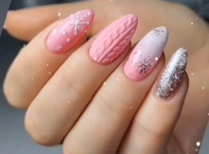 This design blends matte pink shades with raised sweater-knit texture, shimmering glitter, and subtle snowflakes for a warm, cozy early winter aesthetic.