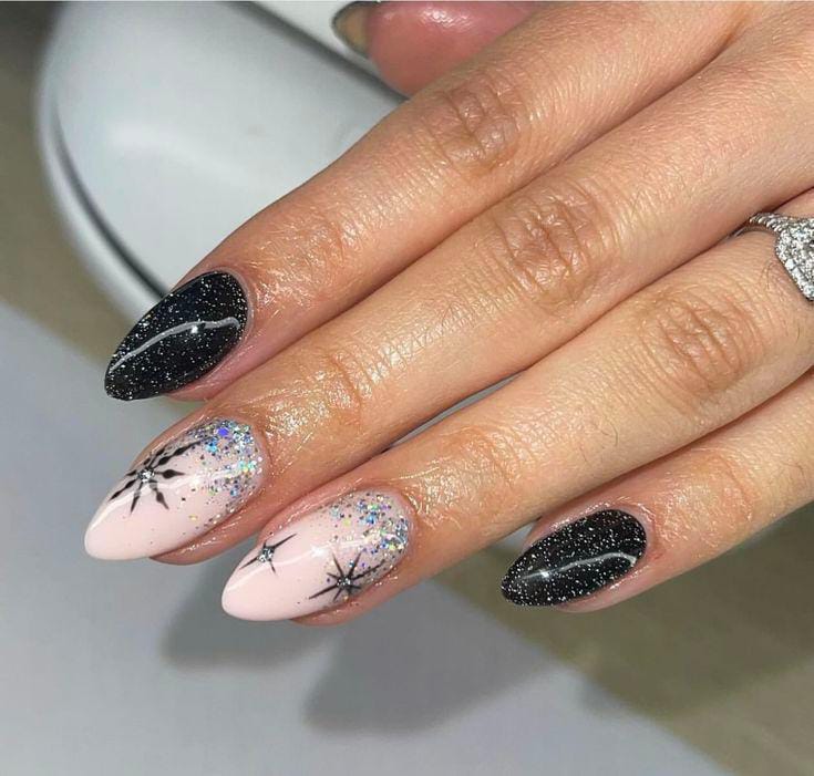 Black galaxy-like glitter nails contrast with pale pink accents, starbursts, and scattered sparkle, giving the set a crisp, early-wintry night-sky vibe.