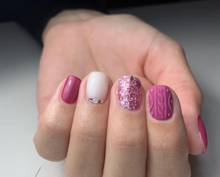 Rich berry tones mix with soft white, chunky pink glitter, and a sweater-style textured nail, offering a playful yet seasonal early-winter feel.