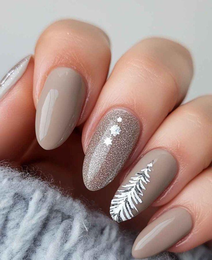 Neutral taupe tones are elevated with fine glitter and a white frosted leaf motif, resulting in a chic and understated early-winter style.