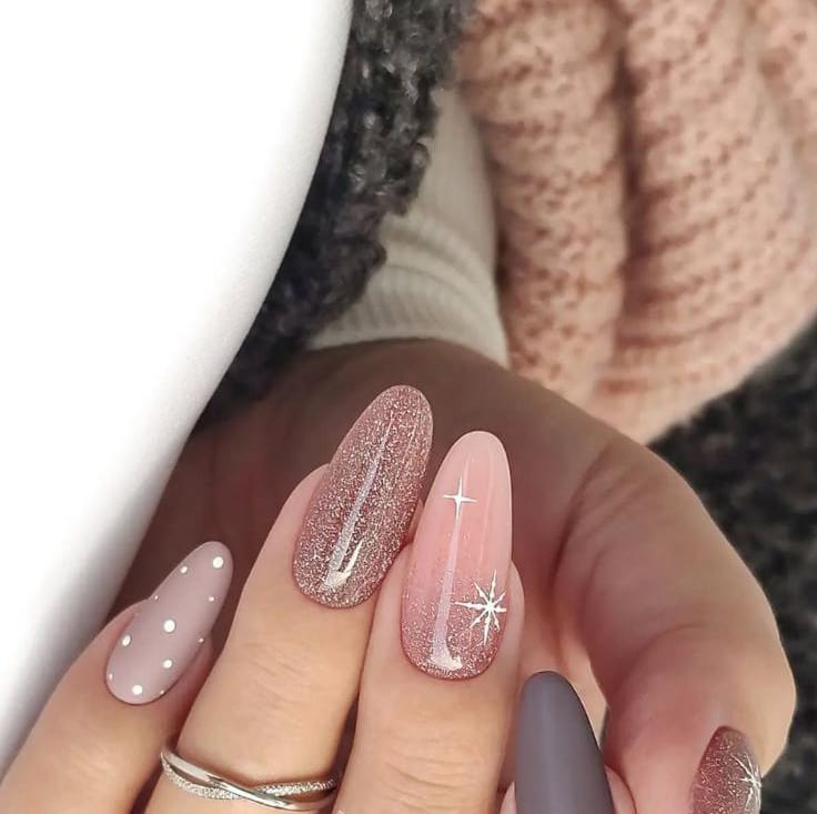 Soft pink and nude tones blend with shimmering glitter and tiny star accents, creating a warm, feminine winter look. The mix of matte dots and glossy finishes gives it a gentle, elegant early winter vibe.