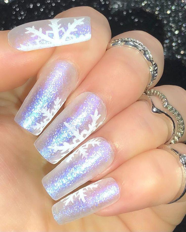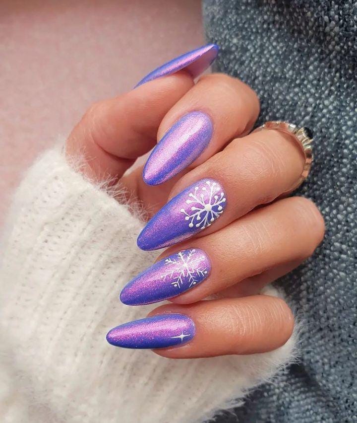 These nails feature a stunning purple-blue iridescent shift with white snowflake accents, giving off a magical frosty glow. The long almond shape enhances the dreamy, early-winter-night aesthetic.