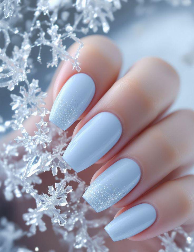 Light icy-blue nails with a soft gradient of fine glitter capture the clean, crisp look of early winter frost. The smooth, glossy finish makes the design feel fresh and serene.