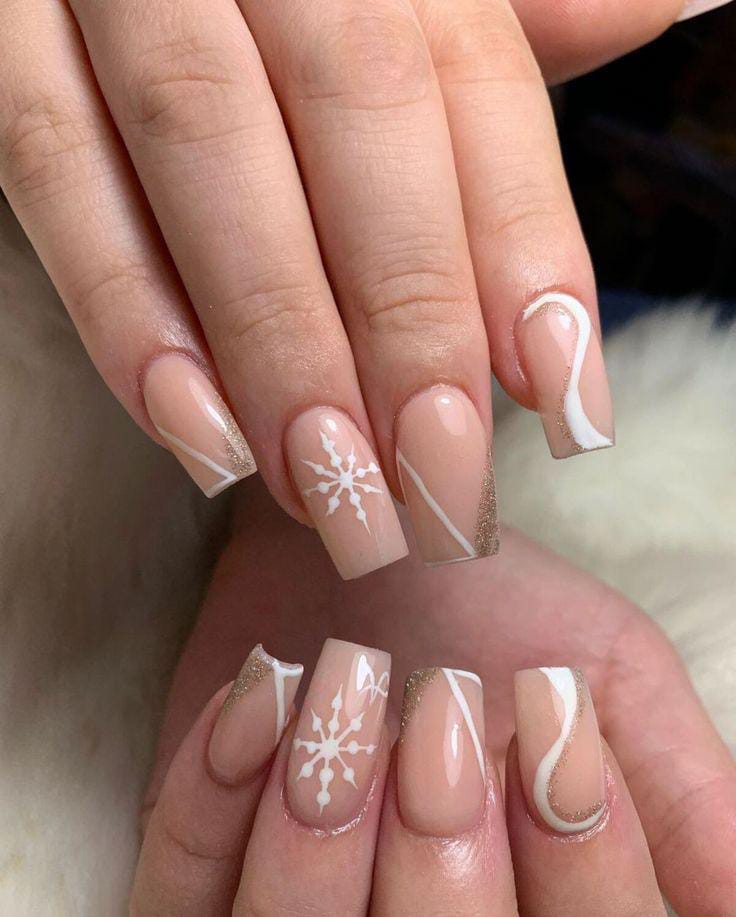 A nude base paired with delicate white snowflakes and subtle gold accents creates a clean, cozy, early-winter look. It’s simple, feminine, and softly seasonal.