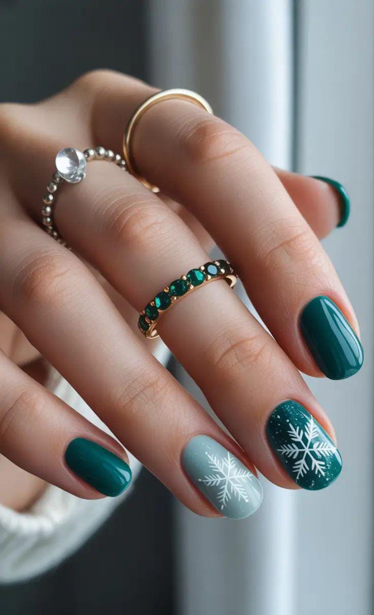 Deep green polish meets frosty light-blue nails, each topped with crisp white snowflakes for a cool, balanced early-winter palette. The look feels rich, modern, and perfectly seasonal.