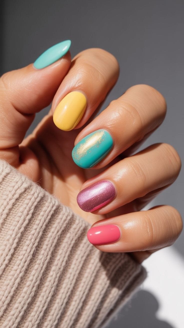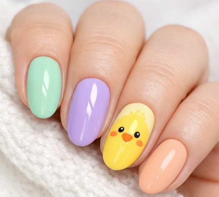 This manicure combines smooth pastel shades like mint, lilac, peach, and yellow with an adorable chick accent nail. The glossy finish and simple color blocking give it a fresh and cheerful spring feel.