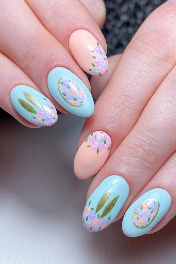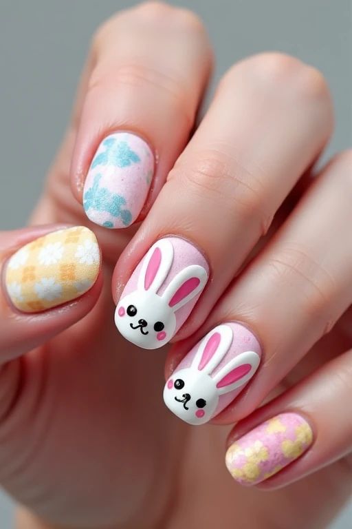These nails feature soft pastel shades with playful bunny accents and delicate floral patterns. The overall vibe is sweet, whimsical, and perfect for a cute Easter celebration.