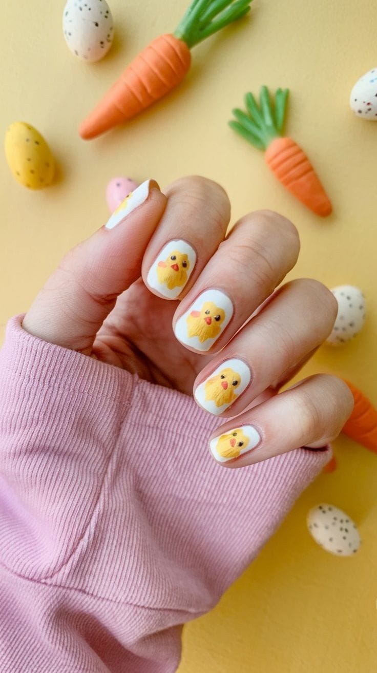 These nails feature adorable yellow chick designs on a soft white base, giving them a bright and playful look. The overall vibe is cute, cheerful, and perfectly festive for Easter.