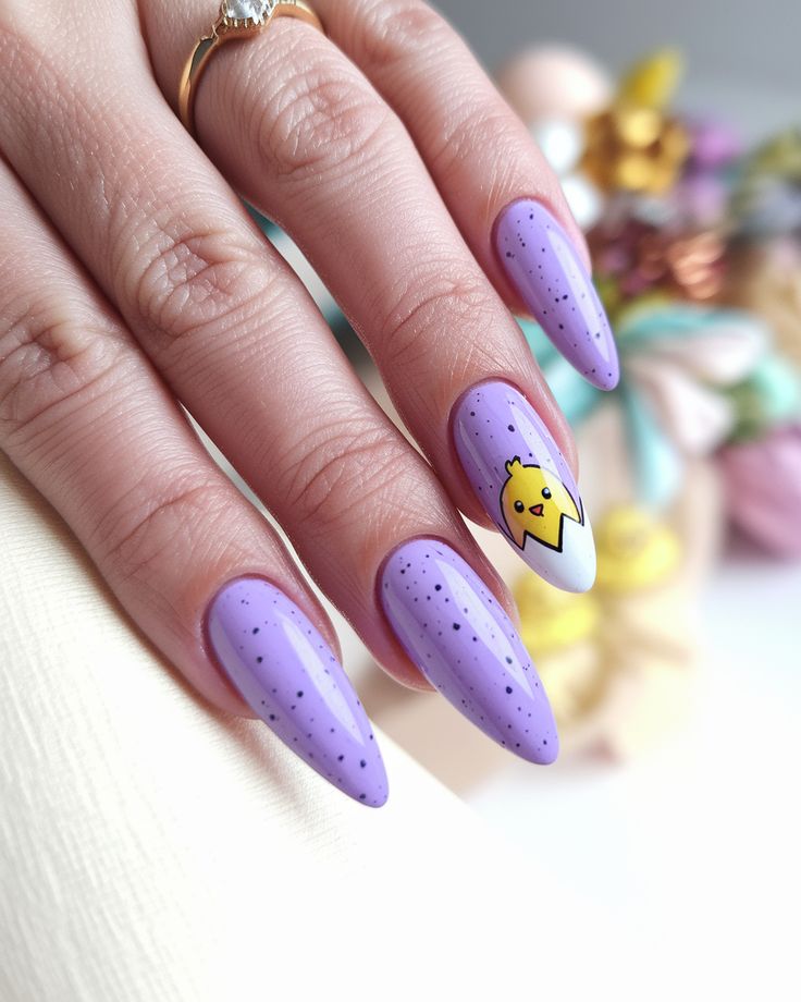 This design pairs a soft lavender base with delicate black speckles and a single cracked egg accent nail. It feels elegant yet fun, blending classic Easter egg inspiration with a modern touch.