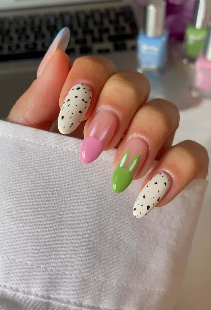 This design mixes creamy speckled egg nails with glossy pink and green bunny accents for a playful Easter look. The vibe is fun and modern with a cute, slightly minimalist twist.