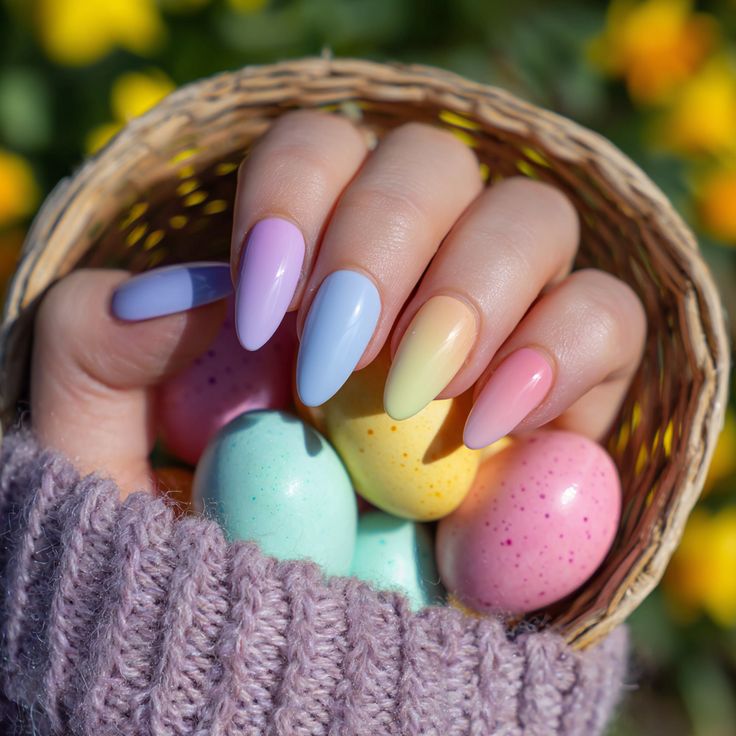 These nails feature smooth pastel shades in lavender, blue, yellow, and pink with a soft ombré effect. The overall feel is delicate, fresh, and inspired by classic dyed Easter eggs.