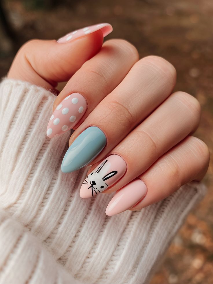 A soft pastel manicure featuring blush pink and baby blue shades with playful polka dots and a cute bunny accent nail. The almond shape and glossy finish give it a sweet, cozy springtime vibe.