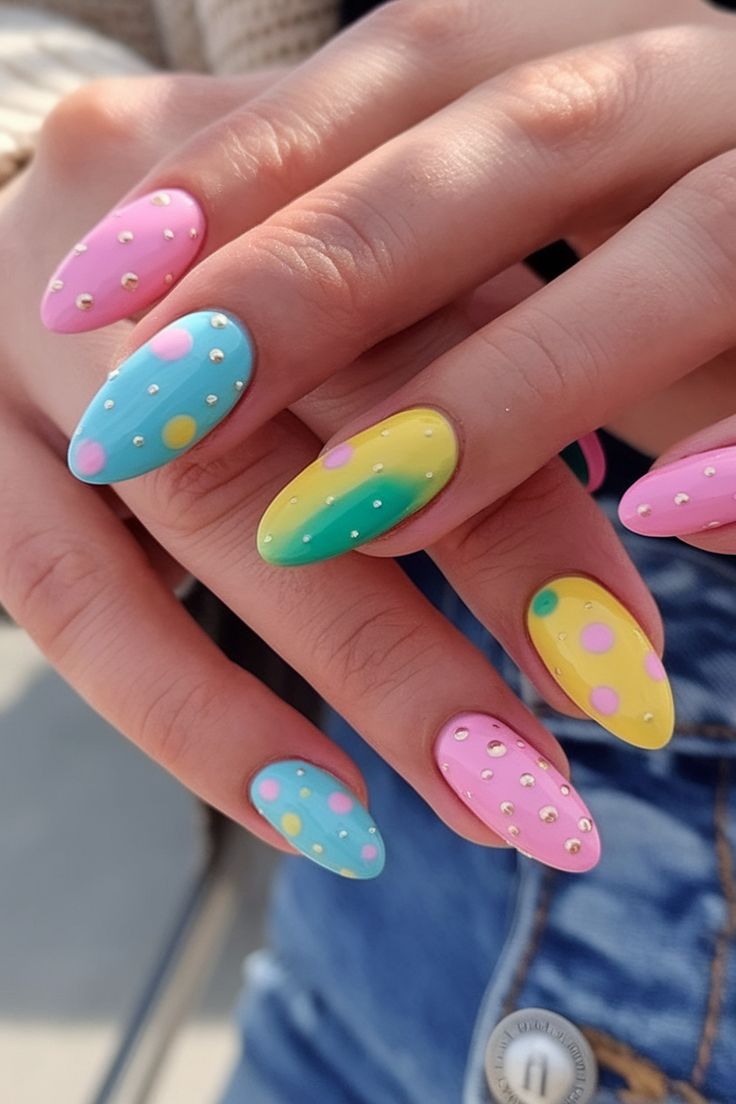 These nails use bright pastel shades like lavender, pink, white, and yellow, decorated with cheerful polka dots and cute egg-like patterns. The look feels fun, youthful, and inspired by colorful Easter treats.