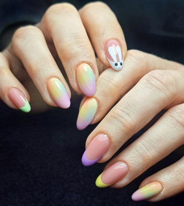 Soft ombré pastel gradients flow across each nail, creating a dreamy Easter egg effect. A cute bunny accent adds a sweet, whimsical touch to the light and airy design.