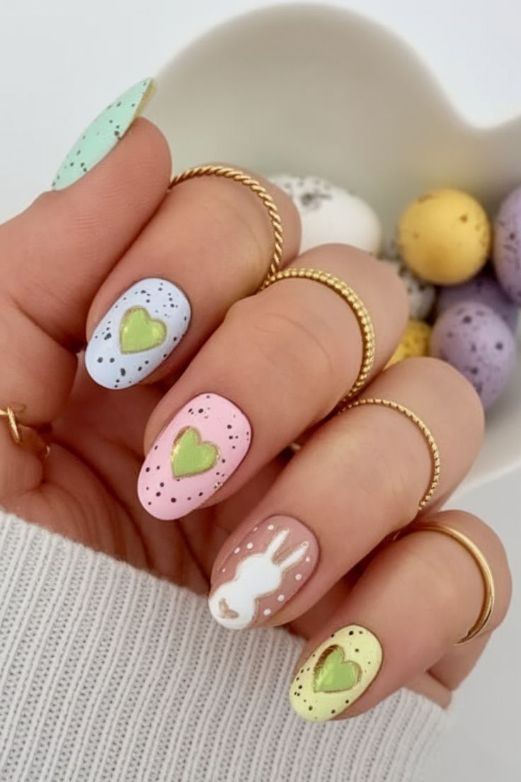 These nails combine soft pink and lavender tones with speckled details that mimic decorated Easter eggs. Gold-outlined hearts and bunny accents give it a charming, handcrafted holiday feel.